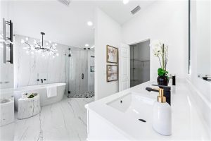 Updating the tiles and flooring with attractive, durable options will enhance the overall look. Repairing any broken tiles is also important for maintaining a clean and polished appearance. Adding fresh caulk in the bathrooms can help prevent water damage and improve the look of the space. Good lighting is key, so consider modern light fixtures and large mirrors to brighten up the area.